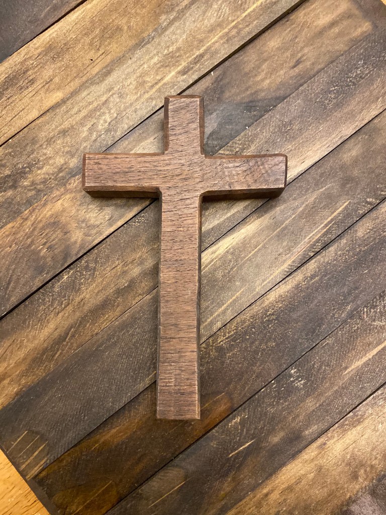 He shaped, sanded, molded, formed, and artistically formed a beautiful pulpit in the shape of a cross. With extra pieces, he made a wall board (where we would place prayer prompts), a shepherd staff, and a smaller tabletop display of Calvary with three crosses.