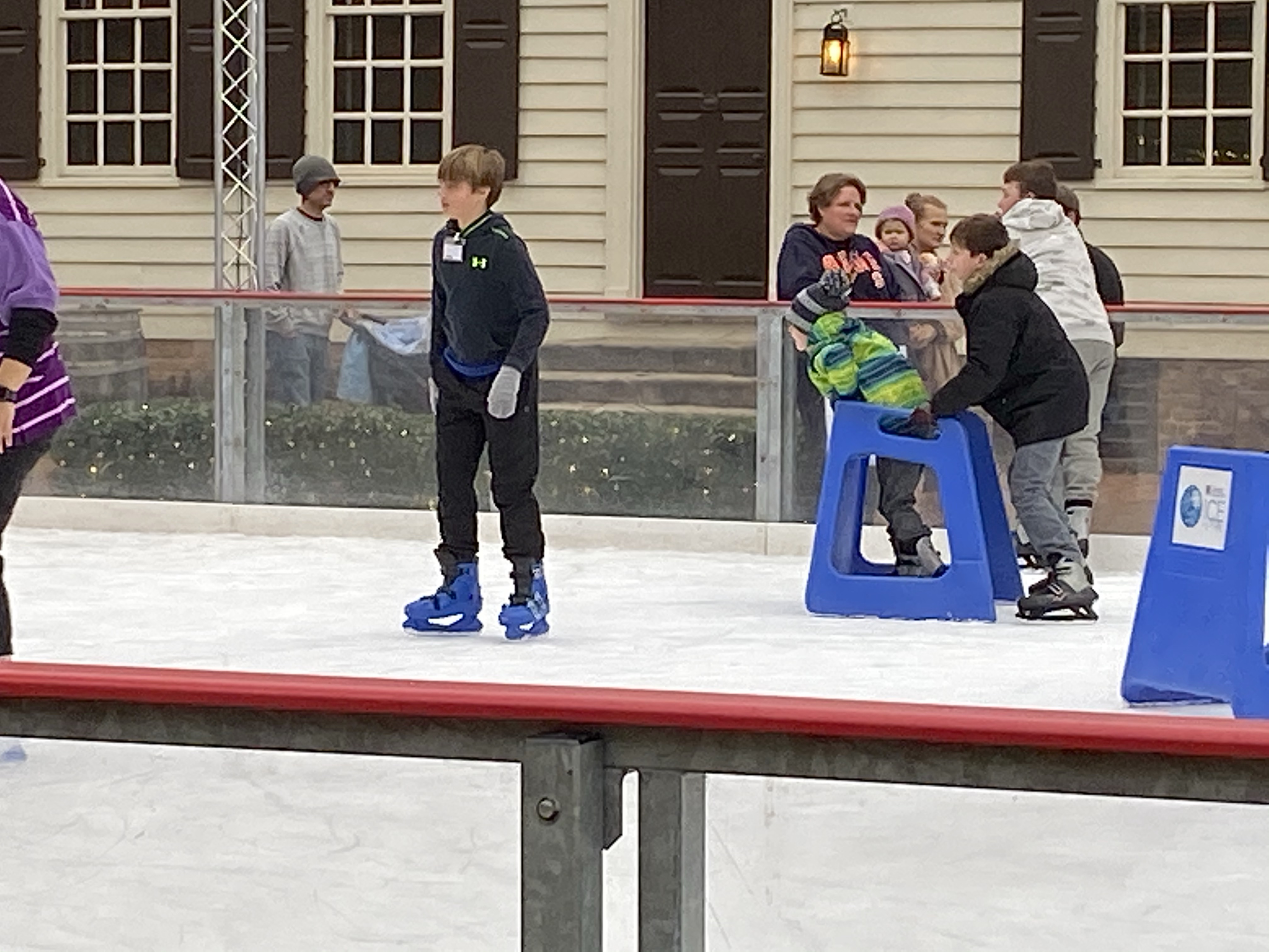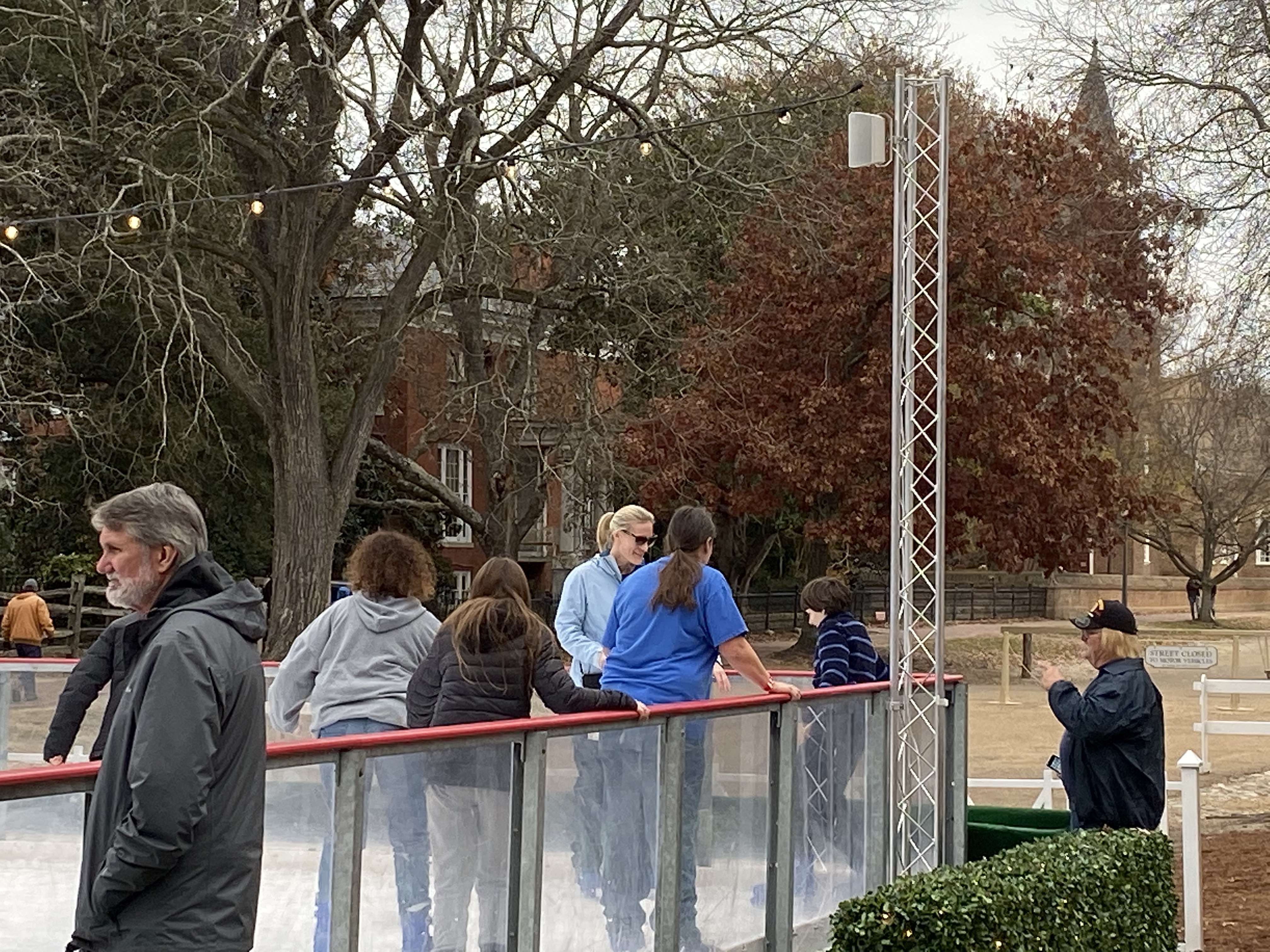 For the holidays, Williamsburg has closed part of Gloucester St. and added a small ice rink. Nothing too fancy, but scores of people gathered to glide, fly, and fall on the ice. And from the rink, Bruton Parrish sits in the background.