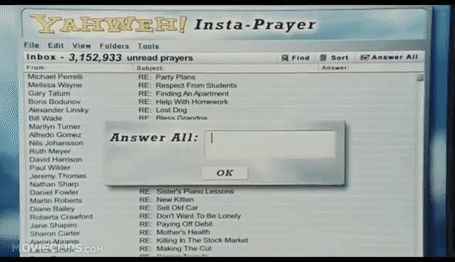 I love the scene from Bruce Almighty when Bruce is answering prayers by email. Just says “yes” to everyone.