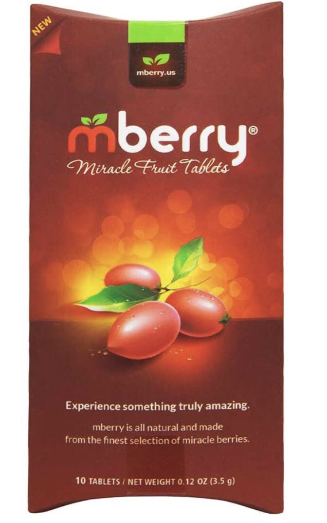 It’s like magic! It’s called mberry: miracle fruit tablets. The concept is you take this one pill, let it dissolve on your tongue, it confuses the taste buds, and for about 90 minutes you think everything that normally tastes really sour will now taste super sweet. A lemon will become a delight to suck on. Vinegar? Go for it. Tart cherries – more like chocolate cherries.