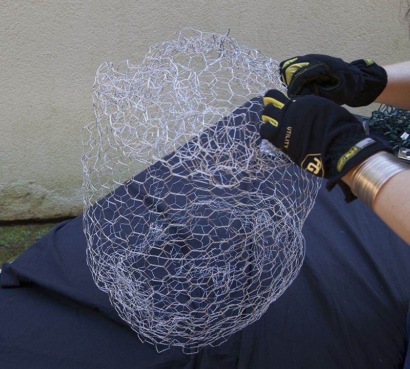 First, measure about 30-36 inches of chicken wire. Cut the wire. Roll it to for a tube of wire. Bend the ends together to attach side A to side B. Then carefully fold one of the open ends into the center. Keep folding and do the same to the other side. Mold and form a globe, a ball of wire that looks similar to a round globe. It was here I wish I got the gloves.