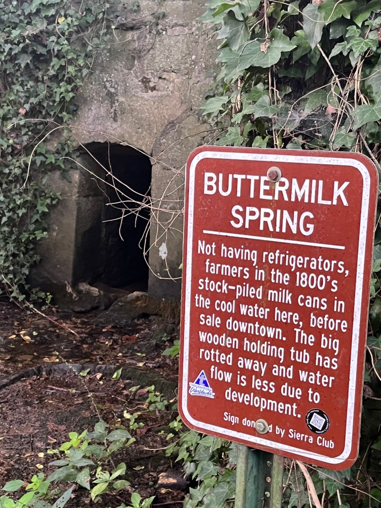 The trail was more a trial-bike trail with ups, down, some bridges over a various gully, and more. It has some historical markers to let you know about the area and how it got the name Buttermilk – which was from the Buttermilk Spring where farmers in the 1800’s cooled their milk before market.