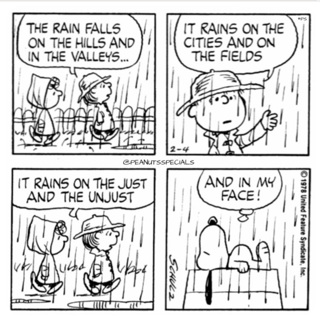 It rains on the just and unjust alike. But like Snoopy, sometimes it just seems it just falls in my face.