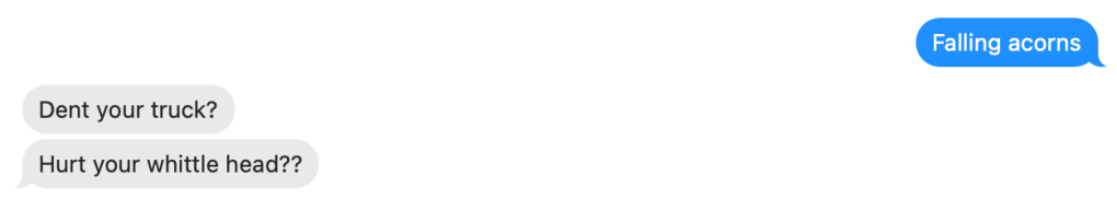 The ACORNS kept falling. One. Five. Twenty. Hundreds. Occasionally I heard the metallic ding from the roof of the car. It hit everything in the shade circle. I texted my wife and she gave no sympathy, no real understanding.