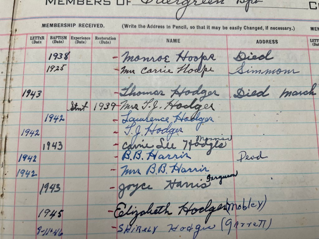 Back to the main story. I looked up when my friends parens joined. And there it was – an entry of a baptism. It had his parents and how they joined. Then a few lines later – a baptism. No month. Just a year. He would have been 13 or 14. I am not sure who baptized him, for the pastor left that year to be a chaplain in the Army. Not knowing the month and all. More research needs to be done.