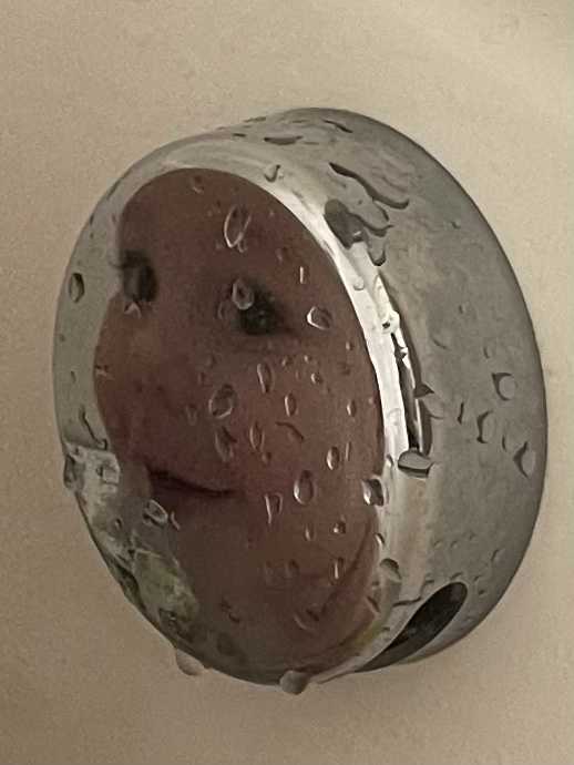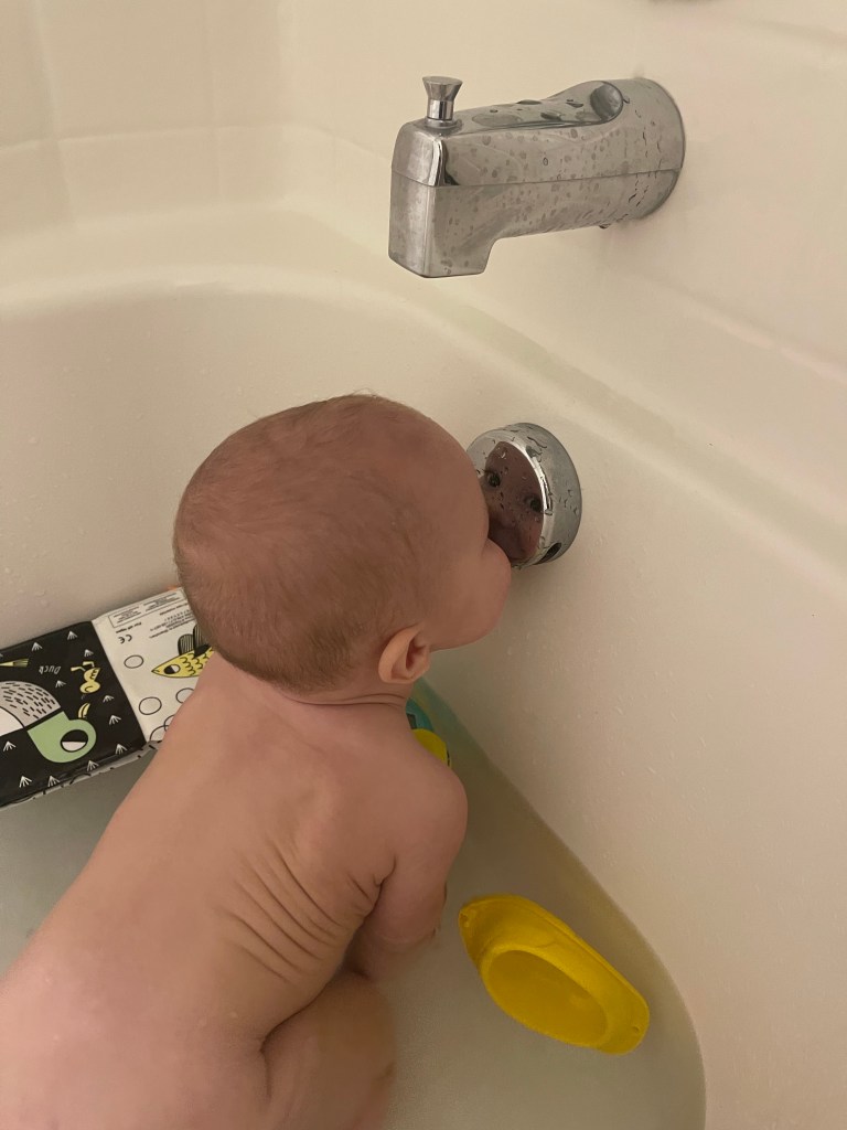 And a picture of my grandkid – overcoming fear of a bath, and no fear of his own reflection …