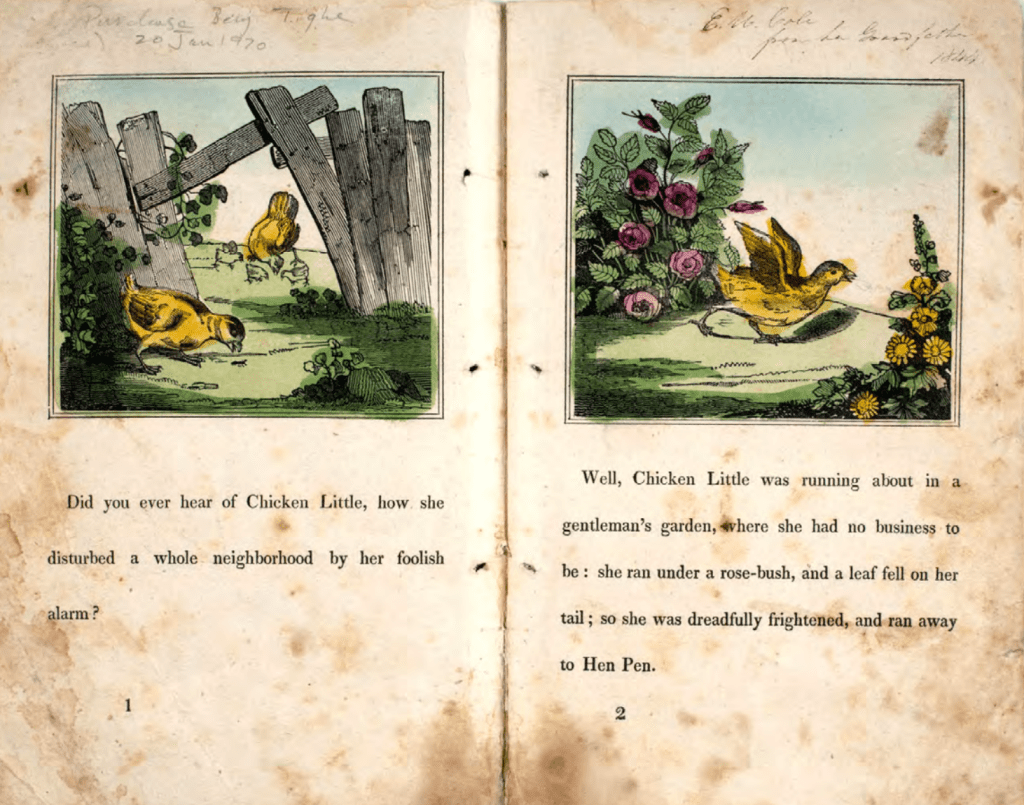 Let’s go back a little bit – the story first shows up in the early 19th century. The Grimm Brothers included a story similar in some of their early works. You see it under Henry Penny, Chicken Licking and Chicken Kluk. It is not a light hearted story, in spite of it being made into a children’s book and even a children’s animated movie.
