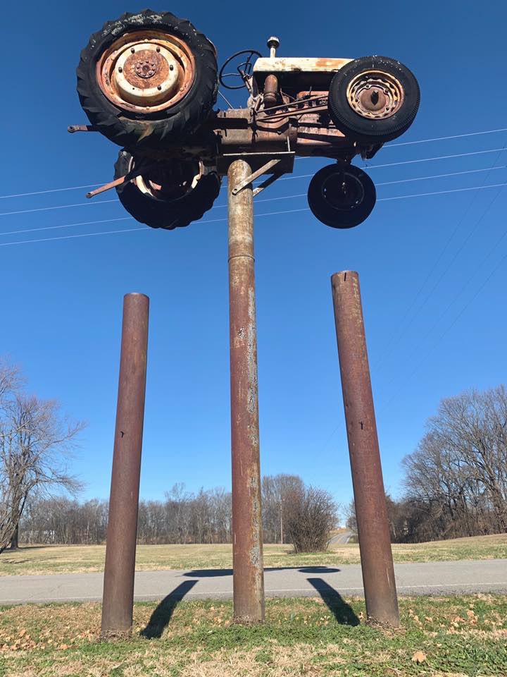 One had a tractor up on top of a big pole. Not sure how it got there. In the same field was a dinosaur made of scrap metal. Made it chased the Harvester up the pole. All I know is that farmer has too much free time.