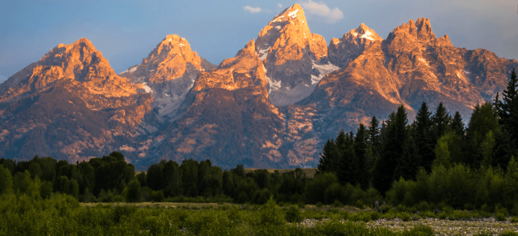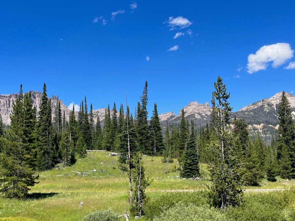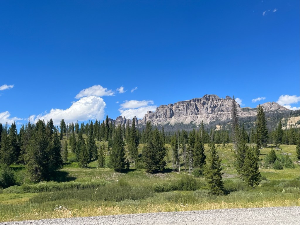Wyoming is so diverse. Rocky Buttes on the right. Grassy plains on the left. Mountains with rocky sides. Mountains all green with evergreens. All this was magnificent but was only getting us ready for The Great Tetons, specifically the Cathedral peaks.
