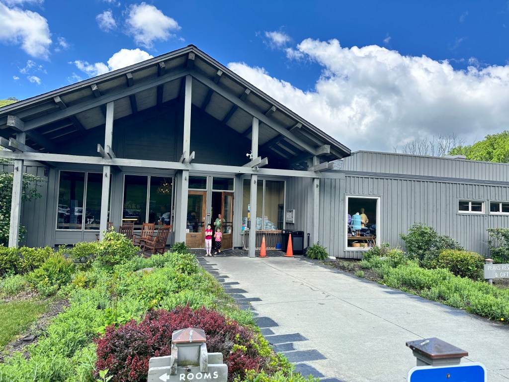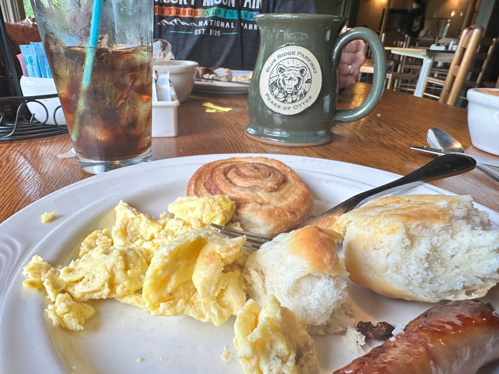 We got a table by the window and prioritized the coffee. The mugs at the Peaks of Otter Lodge are creative stoneware with the name of the Lodge and Blue Ridge Parkway on the mug.