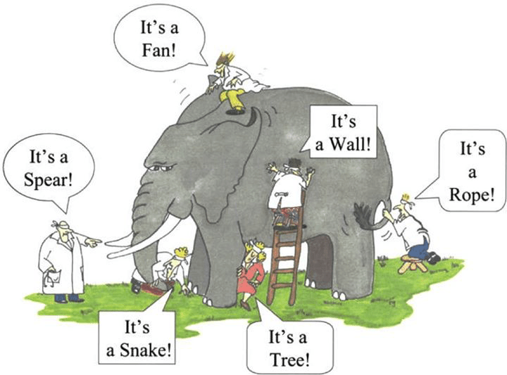 There is the old proverb of a group of blind men describing an elephant. Each of them approaches the majestic animal and uses the senses, mostly touch, to explore it.