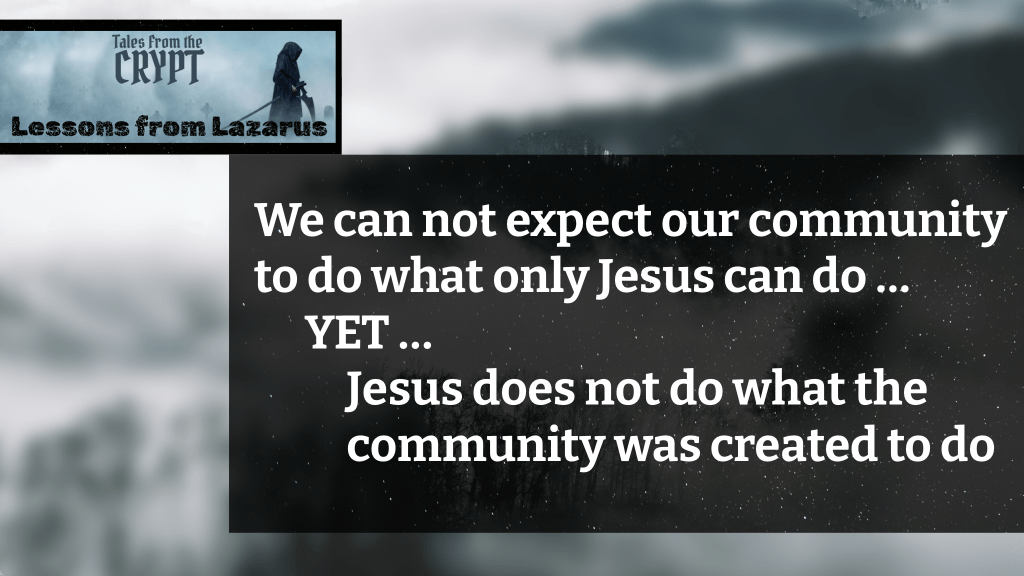And we, even though a new creation, need to remove the grave clothes. He could have had Lazarus come out completely re-clothed. He could have made Lazarus remove his own bindings. But He choose to use those around him. One author said it this way …