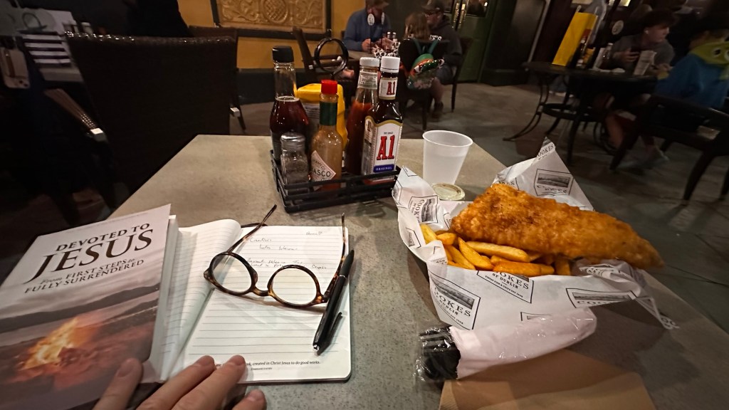I probably was the only one there with books to read and studying to do. I stopped by the Irish pub (honoring Notre Dame’s win) and got fish and chips. I sat at an outside seats and just read, studied, and watched people. My table of one.