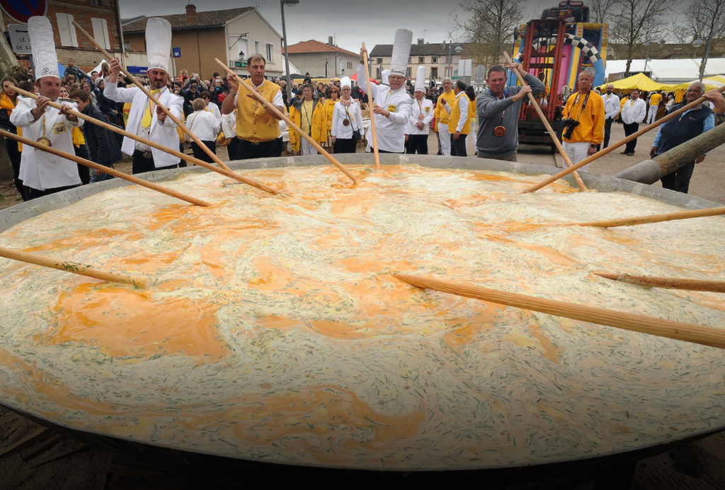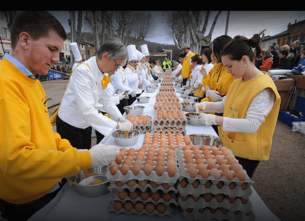 15,000 eggs. 2,000 fed. Global Brotherhood of the Knights of the Giant Omelette. History going back to Napoleon. (He loved an omelette from the local tavern, he wanted it for everyone to taste it. Still going on today. (Photos by GETTY IMAGES)