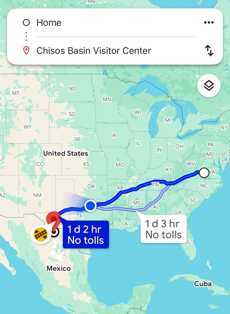 So, I headed to Texas. Didn’t tell the son I was coming (did tell daughter in law) and going to pick him up, with 3 year old grandson, and head to Big Ben National Park (on my bucket list.)