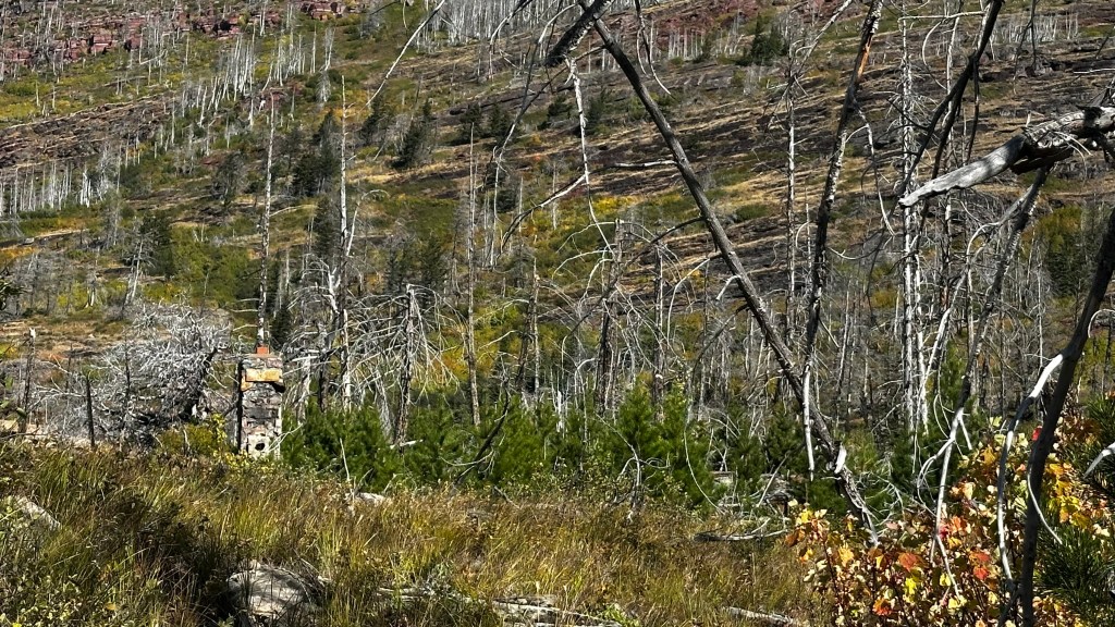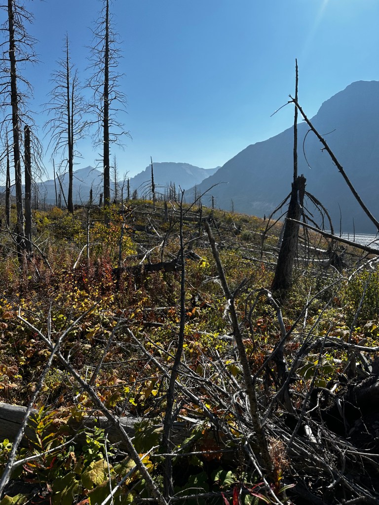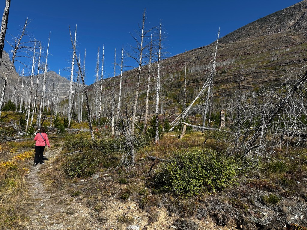 The east side of Glacier NP was still showing evidence of a not so distant forest fire. Burned trunks, charred fallen tree, cleared landscaping.