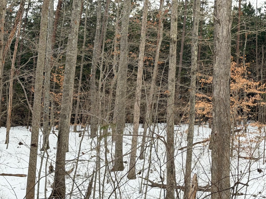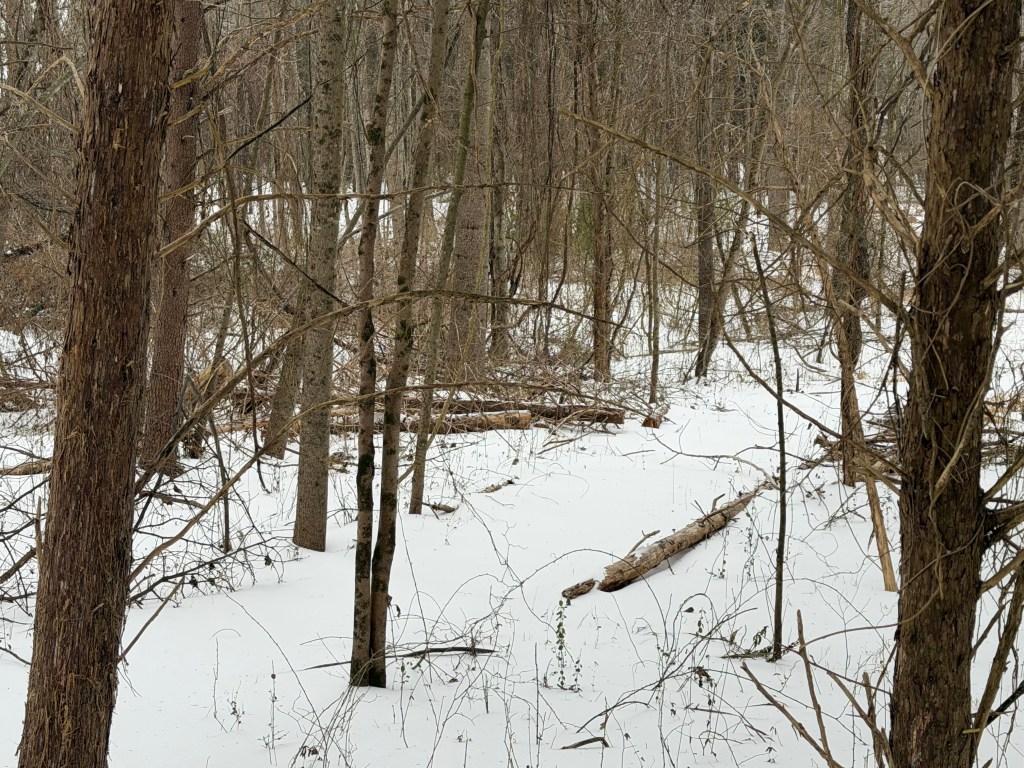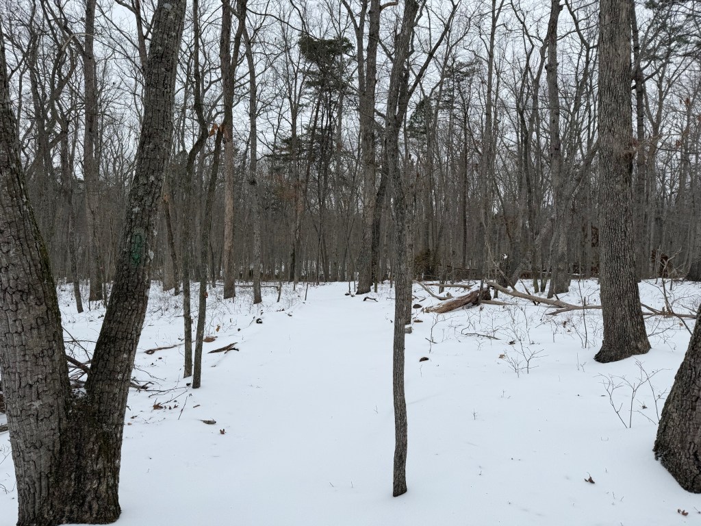 On day one, I walked around in the snow. It was powdery and I felt no qualms. I even walked the Evergreen trail and felt the contentment in the isolation of one with trees, creeks, deer tracks, and the sound of wind through the empty branches.